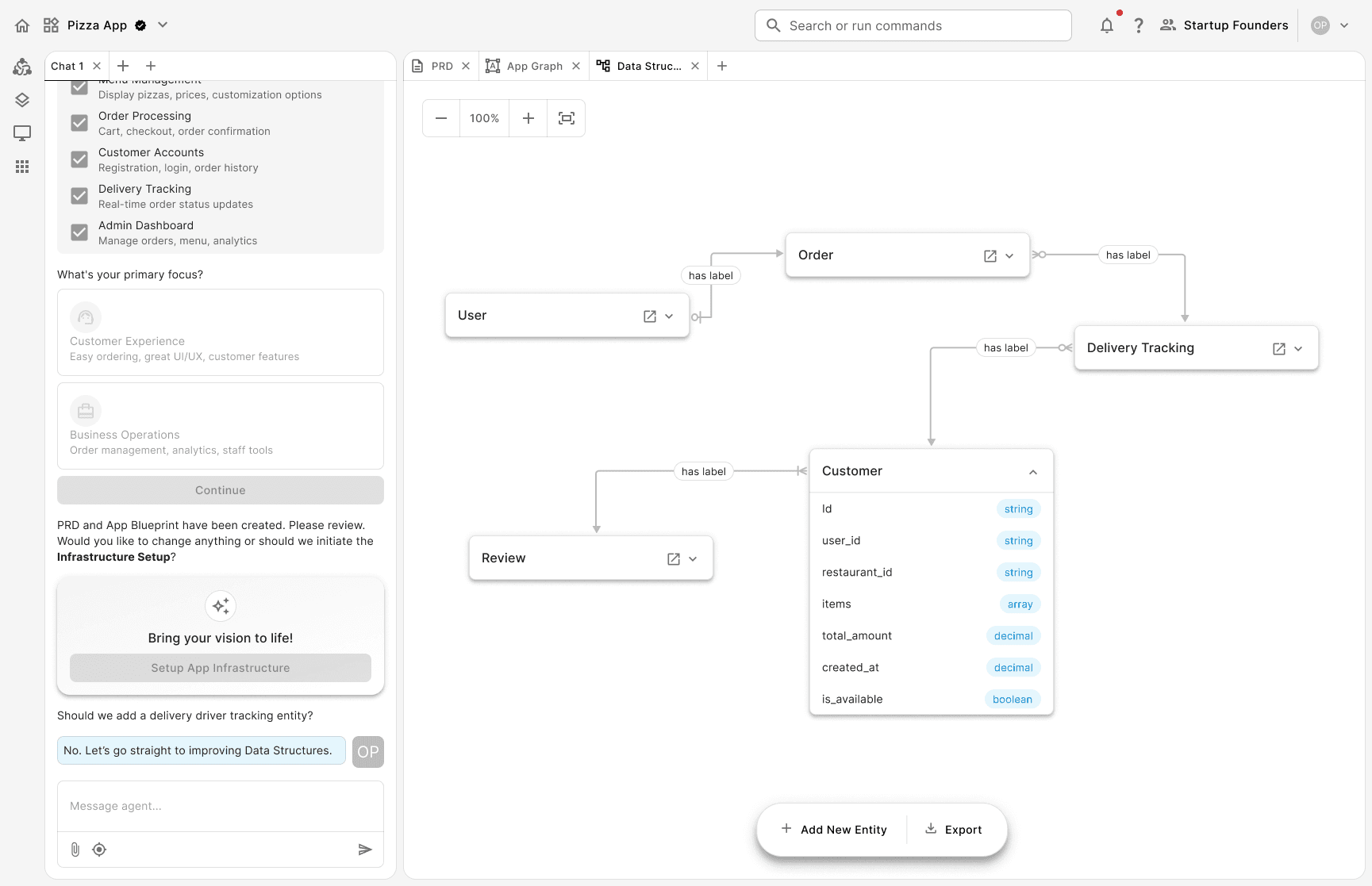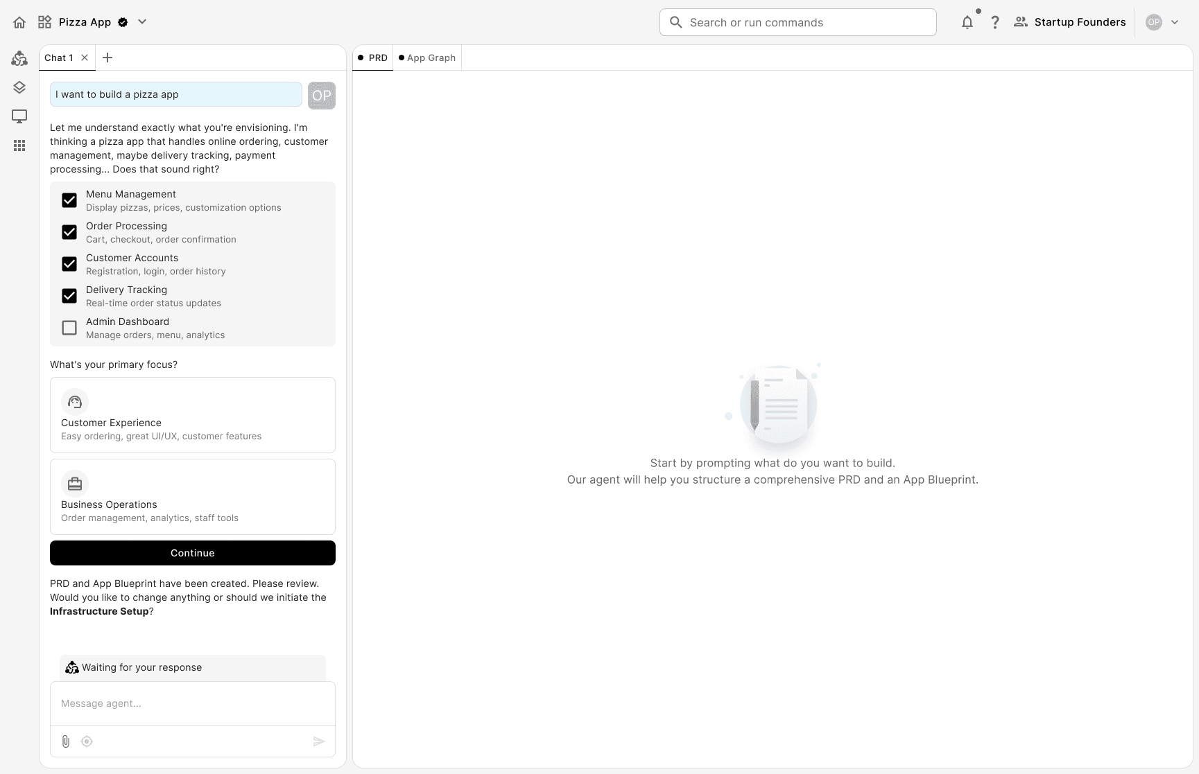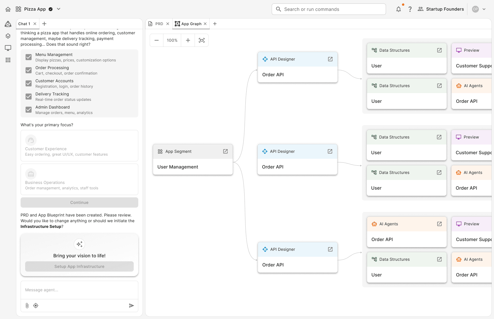 Prompt: the system translates the user's input into a Product Requirement Document (PRD). Once the user refines and approves the PRD, the system generates an app graph. The graph works as a high-level visualization of the app's system architecture.