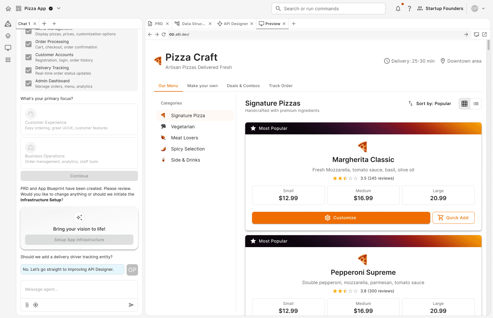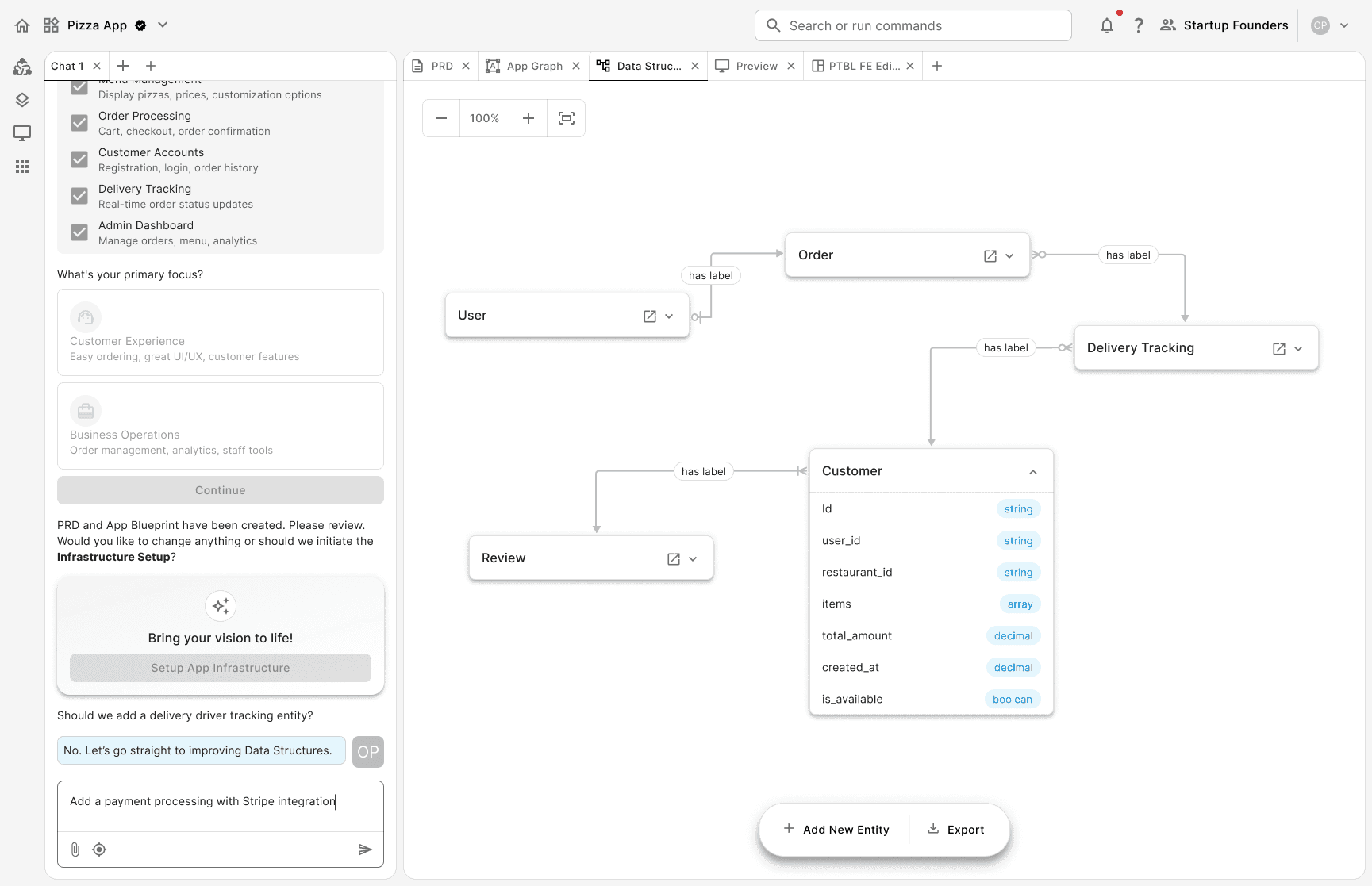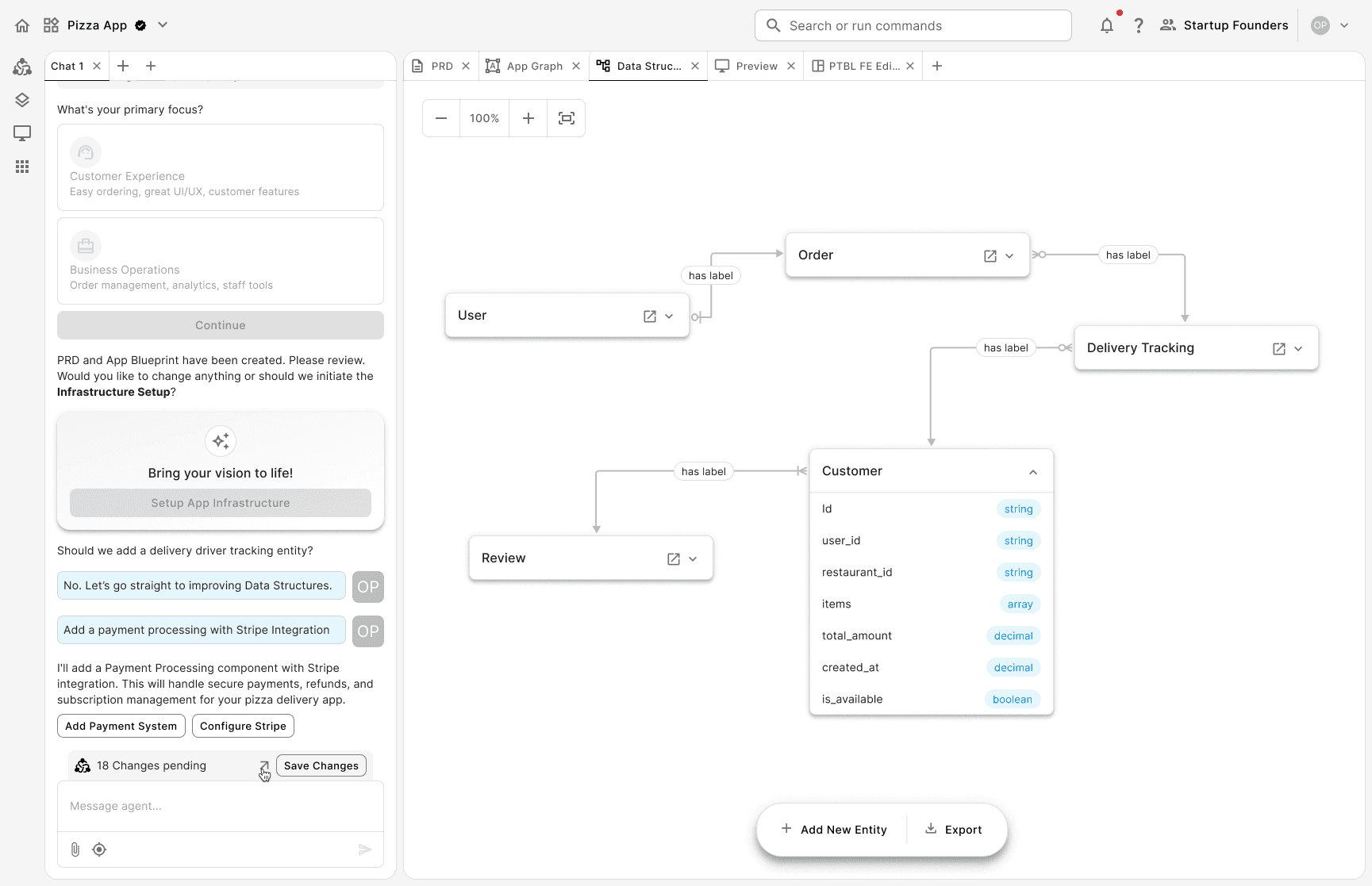 Prompt: the system translates the user's input into a Product Requirement Document (PRD). Once the user refines and approves the PRD, the system generates an app graph. The graph works as a high-level visualization of the app's system architecture.